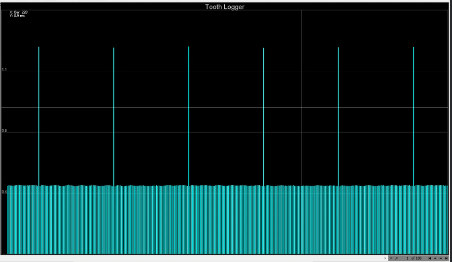 Megasquirtissa tuon väärän napaisuuden huomaa helposti käyttämällä High Speed Loggers välilehdeltä löytyvää Tooth Loggeria. Normaalin triggeripyörän kanssa pitäisi signaalin näyttää seuraavanlaiselta moottorin käydessä: